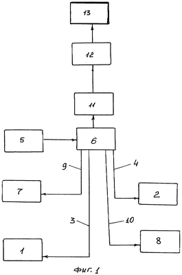 Измерительная система работает следующим образом. В процессе буксировки вдоль полосы обследования посредством блока управления 6 осуществляется попеременная работа источников магнитного поля 1 и 2. Суммарное магнитное поле источника 1 и ферромагнитных масс 14 воздействует на первичный трекомпонентный преобразователь магнитного поля 8, а суммарное магнитное поле источника 2 и ферромагнитных масс 14 воздействует на первичный трекомпонентный преобразователь магнитного поля 7. Сигналы, возникающие при этом, поступают на вход вторичного преобразователя 11, который усиливает и преобразует сигналы. Из вторичного преобразователя 11 сигналы попеременно поступают в вычислительный блок 12, который определяет сигнал, обусловленный наличием ферромагнитных масс или подводного ферромагнитного объекта (при поиске подводных объектов). Далее сигнал поступает на исполнительный блок 13, где он регистрируется и транслируется на систему управления носителя 16, обеспечивающую движение носителя в заданных границах области обследования (производства работ). При поиске подводных объектов сигнал поступает в навигационный модуль, где определяются его координаты.