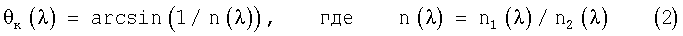 Предположим, что зависимость углов полного внутреннего отражения от длины волны для первой пары оптических сред, образующих границу раздела, возрастающая (d к/d >0), а для второй пары – убывающая (d к/d <0). Для фильтрации заданной длины волны пучок направляют на границу раздела первой и второй сред так, чтобы угол между оптической осью пучка и границей раздела этих сред был бы не меньше к1( ) – критического угла полного внутреннего отражения для . Далее пучок направляют на границу раздела третьей и четвертой сред так, чтобы угол между оптической осью пучка и границей раздела этих сред был бы не больше к2( ) критического угла полного внутреннего отражения для . В этом случае в выходящем пучке луч, распространяющийся по его оси, будет монохроматическим и будет иметь длину волны . Величины углов к1( ) и к2( ) рассчитывают в соответствии с выражениями (1) и (2). Другие лучи этого полихроматического пучка света, распространяющегося в пределах плоского утла , принадлежащего плоскости, в которой находятся оптические оси падающего и отраженного от границ раздела сред пучка излучения, будут падать на границы раздела первого и второго типов в зависимости от их наклона к оси пучка под другими углами, чем осевой луч. Эти углы будут критическими для других длин волн. Поэтому, из каждого полихроматического луча будет отфильтрован монохроматический луч с длиной волны, определяемой углом – углом наклона этого луча к оси полихроматического пучка.