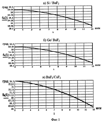 В результате проведенного анализа оптических свойств сред и расчетов зависимостей критических углов от длины волны для комбинаций различных сред были предложены пары, образующие границы раздела с отрицательной производной угла ПВО в интересующей нас ИК-области спектра. На фиг.1 (а, б, в) приведены зависимости к( ), рассчитанные для границ раздела пар сред (Ge/BaF2, BaF2/CaF2, Si/BaF2) с отрицательной производной угла ПВО (в более плотной среде). На фиг.2 (а, б, в) приведены зависимости к( ), рассчитанные для границ раздела пар сред (BaF2/воздух; KCl/воздух; CaF2/воздух) с положительной производной угла ПВО (в более плотной среде).