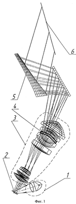 Система работает следующим образом. Источник 1 света излучает свет на пространственный модулятор 2. Пространственный модулятор 2 вносит в излучение источника 1 информацию об изображении и направляет излученный свет в оптическую систему 3, снабженную, по меньшей мере, одним цилиндрическим преломляющим элементом, после прохождения оптической системы 3 свет отражается от отражателя 5 и проецируется на экран 6.