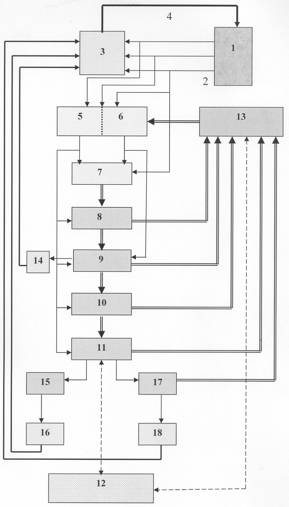 Интегрированная система автоматического координированного управления объектом, взаимодействующим в общем случае с другими смежными объектами, содержащая систему измерения его медленноменяющихся параметров (давления, температуры и расходы рабочих тел в проточных частях, обороты ротора и т.п.), увязанных системой уравнений, описывающих динамику протекающих в объекте рабочих процессов в низкочастотной области спектра, систему автоматического управления с цепью обратной связи, отличающаяся тем, что цепь обратной связи активизируется интеллектуально и включает блок формирования признаков динамической активности первого рода в виде невязок между вычисленными и измеренными параметрами объекта, блок формирования признаков динамической активности второго рода в виде невязок между регламентированными и измеренными значениями параметров, блок контроля соответствия сформированных признаков установленным границам допусков, блоки идентификации причин невязок методом последовательного разграничения альтернативных гипотез, блок базы данных объекта управления, блок коррекции математической модели объекта, блок формирования сигналов управления объектом, блок идентификации неисправностей параметрического типа, блок формирования сигналов управления объектом по его переводу на щадящий режим или аварийной защите, блок идентификации неисправностей структурного типа, блок формирования сигналов аварийной защиты, причем выходы системы измерения 2 соединены с системой управления объекта 3, с входом блока контроля соответствия признаков установленным границам допусков 7 и с входами блоков формирования признаков динамической активности первого и второго рода 5 и 6, ко входам которых подключен выход блока коррекции математической модели объекта 13, выход блока формирования признаков динамической активности первого рода 5 подключен ко входу блока контроля соответствия признаков установленным границам допусков 7 и блоков идентификации причин невязок методом последовательного разграничения альтернативных гипотез 8, 9, 10, 11, выход блока формирования признаков динамической активности второго рода 6 подключен ко входу второго блока идентификации причин невязок методом разграничения второй пары альтернативных гипотез 9 и ко входу блока контроля соответствия признаков установленным границам допусков 7, выход которого подключен к входу первого блока идентификации причин невязок методом разграничения первой пары альтернативных гипотез 8, один из выходов которого подключен к входу второго блока идентификации причин невязок методом разграничения второй пары альтернативных гипотез 9, а другой к входу блока коррекции математической модели 13, один из выходов второго блока идентификации причин невязок 9 методом последовательного разграничения альтернативных гипотез подключен к входу третьего блока идентификации причин невязок 10 методом последовательного разграничения альтернативных гипотез, а другой к входу блока коррекции математической модели 13, а третий к входу первого блока формирования сигналов управления объектом по парированию его динамической активности или переводу на щадящий режим работы 14, один из выходов третьего блока идентификации причин невязок 10 методом последовательного разграничения альтерна