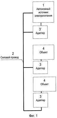 2. Устройство управления системой объектов, содержащее соединенный с автономным источником электропитания силовой провод, адаптеры, подключенные между силовым проводом и объектами, образующие с объектами контуры управления и выполненные программируемыми с возможностью синхронизации приема информации, отличающееся тем, что силовой провод одновременно служит для передачи информации, адаптеры выполнены с возможностью учета помех, адаптер, подключенный между силовым проводом и автономным источником электропитания, выполнен по п.1 формулы и с возможностью синхронизации передачи информации между остальными адаптерами с учетом моментов возникновения помех и регулирования напряжения электропитания.