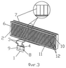 Конденсатор 2 тепловой трубы может быть выполнен также в виде пустотелых пластин с внутренними каналами, сформированными по коллекторной или змеевиковой схеме. На фиг.3 показана коллекторная схема конденсатора 2, которая характеризуется наличием коллекторов: парового 10 и жидкостного 11 соответственно и параллельного пучка каналов 12, соединяющих коллекторы 10 и 11. Такой конденсатор 2 может быть выполнен из двух металлических листов, один из которых имеет тиснение, формирующее внутренние каналы, а второй является гладким и сопряжен с наружным оребрением 7.