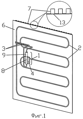 На фиг.1 показан радиатор с оребрением 7, выполненным в виде гофр из тонкостенного листового материала. Соединение гофр с основанием 13 может быть клеевым, паяным или сварным и должно обеспечивать хороший механический и тепловой контакт.