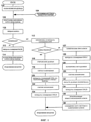 В случае операции записи (в адресат или источник) узел-клиент С должен на шаге 127 выполнить операцию копирования при записи. После завершения всех шагов копирования при записи и пока исходный запрос записи ввода-вывода остается приостановленным, на шаге 126 узел-клиент С передает узлу О сообщение UNLC (запрос снятия блокировки копии).