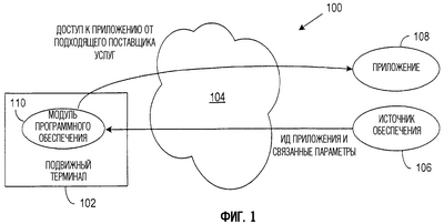 Фиг.1 – примерный вариант осуществления сетевой системы 100, которая использует обеспечение идентификации приложения и доступ в соответствии с принципами настоящего изобретения. Изобретение дает возможность подвижному терминалу осуществлять доступ к сетевому приложению в конкретном сервере приложений, причем множество серверов приложений обеспечивают это приложение. Подвижные терминалы принимают идентификатор приложения (ИД приложения) и связанные параметры доступа во время процесса обеспечения, который дает возможность подвижному терминалу идентифицировать соответствующий сервер приложений и выбрать характеристики доступа, с помощью которых осуществить доступ к приложению, идентифицированному с помощью ИД приложения.