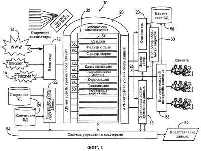 Как упомянуто выше, уровень анализа данных системы 10 включает библиотеку 32 анализаторов, в которой хранятся реализованные программно анализаторы, которые взаимодействуют с API-интерфейсом 20 уровня сбора данных и, следовательно, с уровнем хранения данных. В типичном частном варианте изобретения библиотека 32 анализаторов включает анализатор 34 ссылок, выдающий ссылки на определенную страницу и/или со страницы, фильтр 36 спама, выявляющий спам в хранилище данных 18, фильтр 38 порнографии, выявляющий в хранилище данных 18 порнографические страницы, анализатор-классификатор 42, который классифицирует страницы на основе наличия на страницах последовательностей терминов, анализатор 44 географических данных, выявляющий на Web-странице любую географическую информацию, анализатор 46 корпораций, анализатор 48 таксономии, выдающий страницы заданной таксономической категории, анализатор 50 регулярных выражений, выдающий поток страниц, содержащих определенное регулярное выражение, и так далее.
