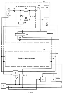 Каждая из ячеек 11…1n сигнализации содержит контактный датчик 10, элемент 11 памяти, первый 12 и второй 13 сигнализаторы, дистанционный переключатель 14, первый 15, второй 16 и третий 17 диоды. Элемент 11 памяти каждой из ячеек 11…1n сигнализации содержит электромагнитное реле 18, первый 19 и второй 20 резисторы и диод 21, анод которого соединен с первым выводом резистора 19 и является первым входом элемента 11 памяти, катод диода 21 соединен с первым выводом резистора 20 и первым выводом обмотки реле 18, второй вывод обмотки которого является вторым входом элемента 11 памяти, а вторые выводы резисторов 19 и 20, соединенные через замыкающий контакт 18.1 реле 18, являются соответственно входом питания и выходом элемента 11 памяти. В каждой из ячеек 11…1n сигнализации первый вывод датчика 10 соединен с первым сигнальным входом ячейки сигнализации, второй вывод – с катодом диода 15, анод которого соединен с первым входом ячейки 11 памяти, второй вход которого соединен с вторым сигнальным входом ячейки сигнализации, выход – с входом сигнализатора 12 и анодом диода 17, катод которого соединен с выходом ячейки сигнализации. Первый вывод первой обмотки дистанционного переключателя 14 соединен с первым входом управления ячейки сигнализации, второй вывод – с анодом диода 16, катод которого соединен с вторым входом управления ячейки сигнализации. Первый вывод второй обмотки дистанционного переключателя 14 соединен с входом питания ячейки сигнализации и через замкнутые переключающий и размыкающий контакты группы 14.1 контактов дистанционного переключателя 14 соединен с входом питания элемента 11 памяти, замыкающий контакт группы 14.1 контактов дистанционного переключателя 14 соединен с входом сигнализатора 13. Первые сигнальные входы ячеек 11…1n сигнализации устройства объединены и подключены к первому выходу формирователя 3 сигналов самоконтроля, вторые сигнальные входы ячеек 11…1n сигнализации также объединены и соединены с первым входом формирователя 3 сигналов самоконтроля, с первым входом питания блока 4 контроля напряжения питания, с шиной 8 питания устройства и с первым выводом кнопки 6. Второй вход питания блока 4 контроля напряжения питания соединен с шиной 9 питания устройства, выход – с вторым входом сигнализатора 5 устройства. Входы питания ячеек 11…1n сигнализации объединены и подключены к второму выходу формирователя 3 сигналов самоконтроля, второй вход которого непосредственно, а вход управления через замыкающий контакт кнопки 7 подключены к шине 9 питания устройства. Входы сброса ячеек 11…1n сигнализации объединены и соединены с вторым выводом кнопки 6, выходы также объединены и соединены с первым входом сигнализатора 5. Первые входы управления ячеек 11…1n сигнализации объединены и подключены к выходу блока 2 управления, выходы группы выходов которого подключены к вторым входам управления соответствующих ячеек 11…1n сигнализации. Датчики 10 ячеек 11…1n сигнализации реализованы на размыкающих контактах кнопочных переключателей типа ПКн 105, конструктивно размещаются на контролируемых объектах и соединяются с ячейками 11…1n сигнализации с помощью двухпроводных линий связи (на фиг.1 датчик 10 показан как бы размещенным внутри ячейки сигнализации 11, хотя конструктивно он размещается за пределами этой ячейки сигнализации). Сигнализаторы 12 и 13 реализованы на све