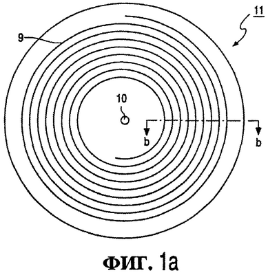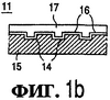 Фиг. 1b – поперечное сечение по линии b-b носителя 11 информации записываемого типа, в котором прозрачная подложка 15 обеспечивается слоем 16 записи и защитным слоем 17. Защитный слой 17 может содержать дополнительный слой подложки, например, как в случае DVD, где слой записи находится в подложке толщиной 0,6 мм, а дополнительная подложка толщиной 0,6 мм присоединена к его оборотной стороне. Предварительно сформированная сплошная спиральная канавка 14 может быть реализована, как углубление или подъем материала подложки 15, или как изменение свойства материала по сравнению с его окружением.