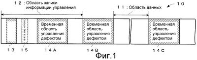 Как показано на фиг.1, носитель 10 записи предусматривается со следующим: область 11 данных; область 12 записи информации управления; определенная область 13 управления дефектами; множество временных областей 14А, 14В и 14С управления дефектами; и область 15 записи информации о состоянии.