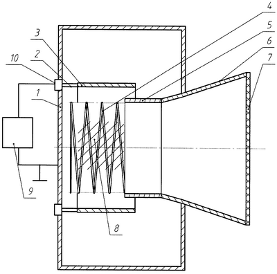 В качестве источника питания 9 возможно использование генератора импульсного напряжения, выполненного, например, по схеме Аркадьева-Маркса [4] (Месяц Г.А., «Генерирование мощных наносекундных импульсов», М.: Атомиздат, 1972), либо взрывомагнитного генератора с обострителем напряжения на основе электрически взрываемых проводников [5] (Асиновский Э.И., Лебедев Е.Ф., Леонтьев А.А. и др., «Взрывные генераторы мощных импульсов электрического тока», М.: Наука, 2002).