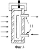На фиг.4 показан вариант конструкции модуля, подключенного к системе принудительной циркуляции жидкости через патрубки 11, расположенные на боковой стороне корпуса. Стрелки показывают направление движения жидкости. Внешний контур циркуляции жидкости располагается ниже уровня модуля. Циркуляция жидкости обеспечивает охлаждение фотопреобразователей, снижение рабочей температуры и повышение их КПД. Тепловая энергия от жидкости передается для накопления и использования во внешний контур. Стрелками показано направление солнечного излучения, которое может иметь повышенную интенсивность за счет использования оптического концентратора и размещения модуля в его фокусе. Жидкостная система теплоотвода позволяет сохранить высокий КПД фотопреобразователей в условиях использования концентрированного солнечного излучения.