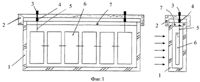 Способ изготовления модуля, представленного на фиг.1, реализуется следующим образом. Из стекла или прозрачного пластика, например поликарбоната, изготовляют щелеобразный сосуд 1 с плоскими стенками. При изготовлении сосуда используются методы литья, экструзии, пайки или склеивания. Для повышения прочности торцы сосуда особенно с наружной стороны целесообразно сделать закругленными. Один из торцов оставляют открытым и к нему изготовляют крышку 2 из диэлектрического материала. На крышке 2 устанавливают токопроводящие клеммы 3 с узлом крепления 4 токосъемов 5. Фотопреобразователи 6 соединяют между собой посредством токосъемов 5 и прикрепляют их к крышке 2 через узел крепления 4. Заливают в сосуд 1 жидкость, например силоксановую, вставляют в сосуд фотопреобразователи и закрывают крышку 2. При необходимости ремонта модуль легко разобрать на части и заменить или отремонтировать любой из его элементов. Причем в утиль уходит лишь незначительная доля модуля, Например, самая дорогостоящая часть – фотопреобразователи могут быть отсоединены друг от друга, рассортированы по КПД и повторно использованы в отремонтированных модулях.