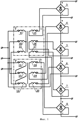 Вторичные обмотки трансформаторов непосредственно друг с другом не связаны. Выводы обмоток 15-20 (магнитосвязанных, соответственно, с первичными обмотками 9-14) соединены с входами, соответственно, выпрямительных ячеек 3, 5, 7, 8, 4 и 6.