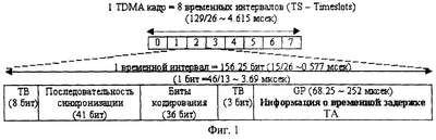 Для пояснения сущности изобретения рассмотрим особенности функционирования систем связи с частотно-временным разделением каналов на примере системы связи стандарта GSM (следует отметить, что указанные ниже особенности присущи практически всем системам связи с частотно-временным разделением каналов [4]). Первая установка соединения абонента с БС осуществляется по направлению “вверх” (направление от абонента к БС). Данное соединение происходит в виде пакета доступа (АВ – access burst) по каналу параллельного доступа (RACH – random access channel). Основной характеристикой пакета доступа является то, что кроме последовательности синхронизации (49 бит) и битов кодирования (39 бит) передается информация о временной задержке распространения сигнала от МС до БС.Информация о временной задержке передается в защитном интервале (GP – guard period), временная длительность которого составляет 68.25 бит или 252 мкс. Графическая интерпретация временных кадров представлена на фиг.1. Таким образом, при функционировании данных систем осуществляется “выравнивание” временных кадров с учетом расстояния от БС до МС с точностью до 1 бита (48/13 мкс). Данное положение не учтено в способе-прототипе, т.к. в нем предполагалось, что существует временная задержка во временных последовательностях от МС до БС, определяемая расстоянием между ними, вследствие чего при определении координат МС в данных системах точность достаточно низкая.