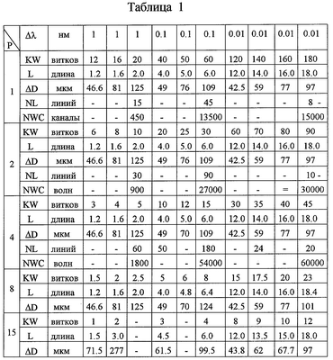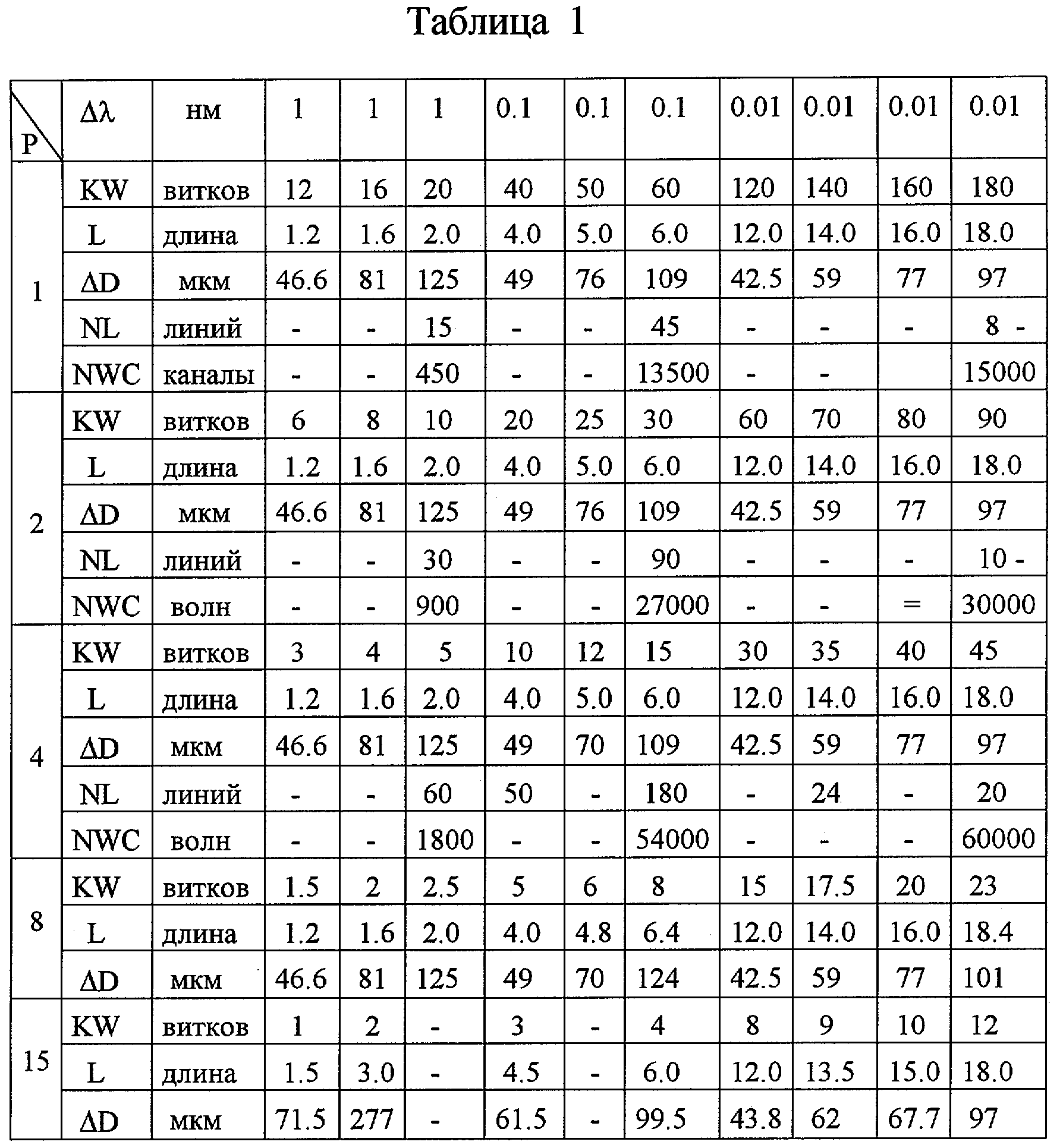 В таблице 1 приведены зависимость от числа призм Р и числа витков в спирали KW значений оптической длины спирали L в метрах и расстояния D в микрометрах для =0.5, L=0.1 метра при  =1,  =0.1 и  =0.01 нанометр. В таблице приведены значения D, в 1.5-2.5 раза превышающие шаг между зеркалами растров dd=50 мкм, необходимый для оптических АТС, что дает возможность существенно уменьшить взаимные влияния соседних частотных каналов.