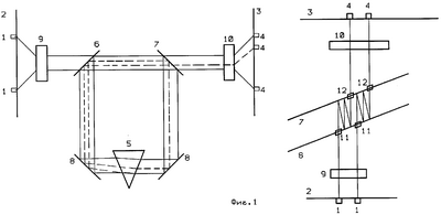 На фиг.1 путь оптических сигналов идет через оптическую систему 9, входное отверстие в зеркале 6, зеркало 7, призму 5, замыкающие кольцо зеркала 8, выходное отверстие в зеркале 7 и оптическую систему 10.