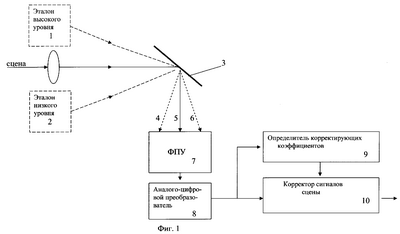 Наиболее близким по технической сущности к заявляемому изобретению является способ [3] двухточечной коррекции, который обеспечивает компенсацию по чувствительности и по смещению независимо от сцены, так как использует для определения корректирующих коэффициентов сигналы двух эталонных источников – высокой и низкой интенсивности излучения. Способ заключается в том, что сканируют сцену и регистрируют отсчеты сигналов элементов фотоприемного устройства, сканируют эталонные источники и регистрируют отсчеты их сигналов, по отсчетам сигналов эталонных источников определяют корректирующие воздействия – коэффициенты для коррекции по чувствительности и смещению элементов фотоприемного устройства, корректируют отсчеты сигналов сцены – вычитают из значений отсчетов корректирующие коэффициенты по смещению и умножают разности на корректирующие коэффициенты по чувствительности.
