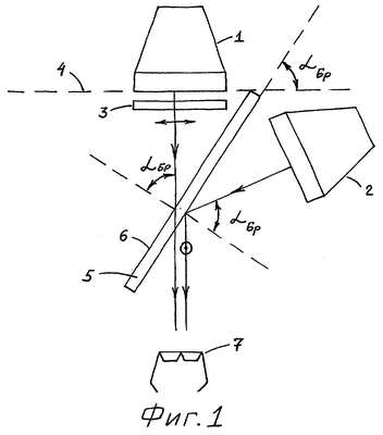В качестве прозрачной пластины для совмещения изображений может быть использована, например, стеклянная пластина с показателем преломления n2=1,6, при этом угол Брюстера Бр будет равен 58°, или, например, с n2=1,7 ( Бр=59,5°).