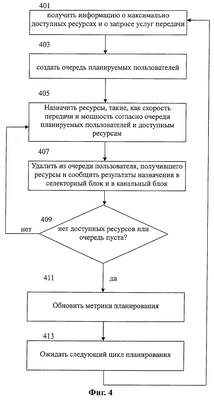 В процессе реализации описанного выше способа может происходить постоянное обращение к фиг.4. Поскольку способ согласно изобретению реализован программным обеспечением, инсталлированным в контроллере 305, каждая операция на фиг.4 обозначена модулем. В модуле 401 контроллер 305 получает информацию о максимальных планируемых ресурсах, доступных для системы, и информацию о запросе услуг передачи данных из устройства памяти 301, на основании которой контроллер планирует скорость передачи. В модуле 403 контроллер 305 создает очередь планируемых пользователей согласно метрикам планирования пользователей. Очередь пользователей создается по принципу: чем выше приоритет планируемого пользователя, тем выше его ранг в очереди планируемых пользователей. В модуле 405 контроллер 305 назначает скорости передачи планируемым пользователям согласно их порядку в очереди планируемых пользователей, ограниченной имеющимися в настоящее время планируемыми ресурсами. В модуле 407 контроллер 305 удаляет пользователя, получившего ресурсы, из очереди планируемых пользователей. В то же время контроллер 305 посылает уведомление в соответствующий селекторный блок 205, чтобы он передал данные планируемого пользователя в канальный блок 207. После этого канальный блок 207 обрабатывает данные согласно скорости передачи, назначенной контроллером 305. Если в модуле 409 контроллер 305 обнаружил, что в системе еще есть планируемые ресурсы и что очередь планируемых пользователей не пуста, то контроллер 305 повторяет процедуру, начиная с модуля 405, до модуля 409; в противном случае, он выполняет сразу же модуль 411, обновляя метрику планирования планируемых пользователей. В модуле 413 контроллер 305 ожидает следующего цикла планирования и повторяет процедуру, начиная с модуля 401, до модуля 411 согласно показаниям таймера 303.