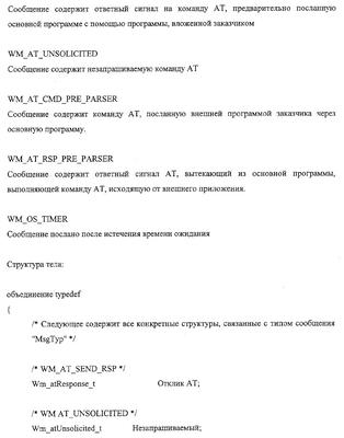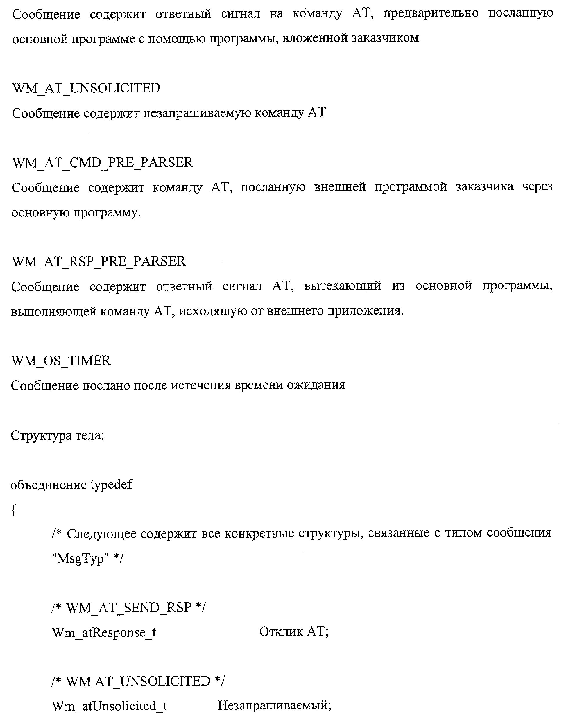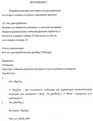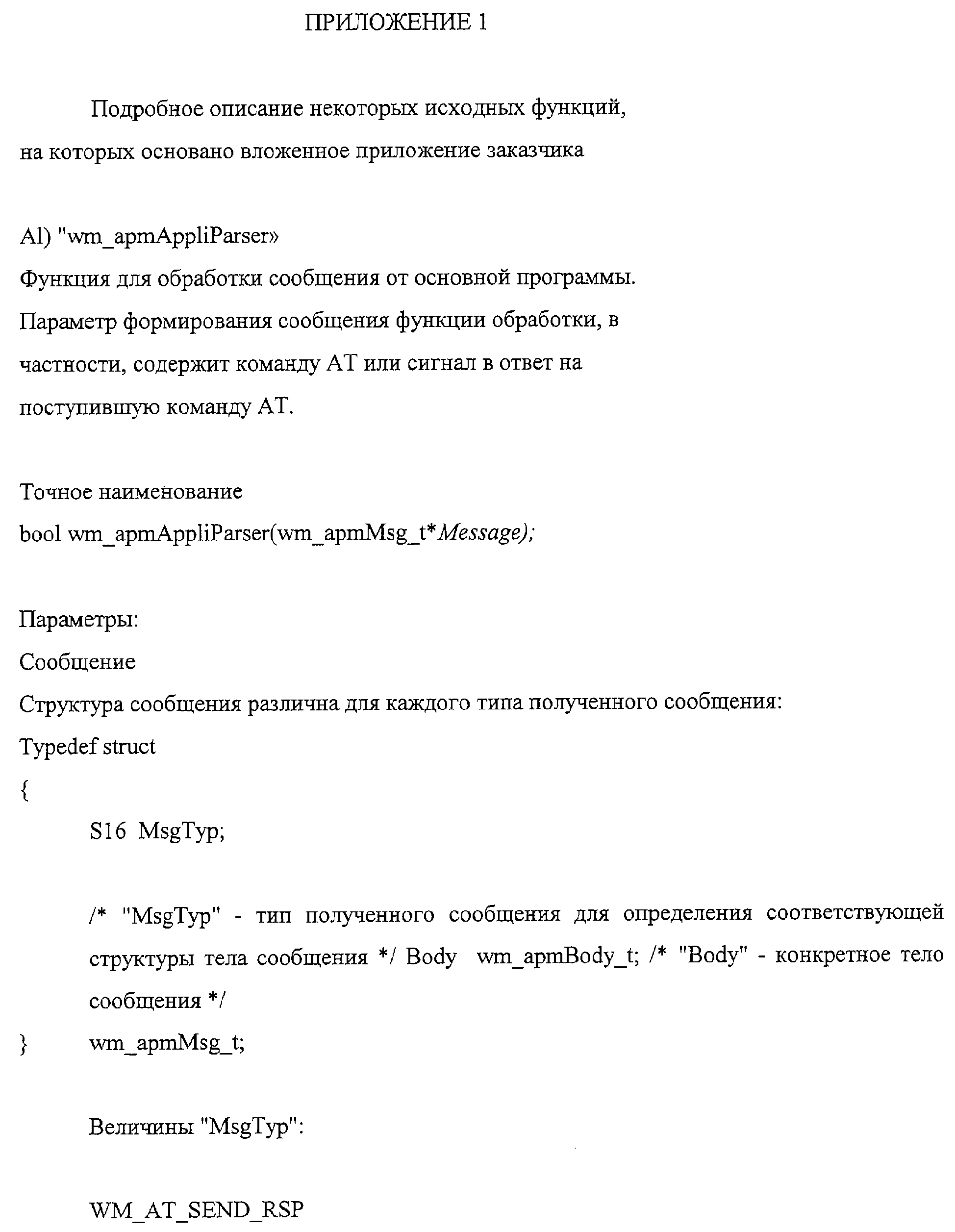 10. Способ по п.1, отличающийся тем, что указанная программа, вложенная заказчиком, содержит прикладную программу заказчика, в частности, основанную на наборе исходных функций, каждая из которых предоставляет возможность посылки или приема команд драйвера или ответных сигналов на команды драйвера на основное приложение или от основного приложения, причем указанный набор исходных функций, в частности, содержит функцию (“wm_apmAppliParser”) для обработки сообщения, исходящего от основной программы, при этом указанное сообщение является параметром указанной функции обработки.