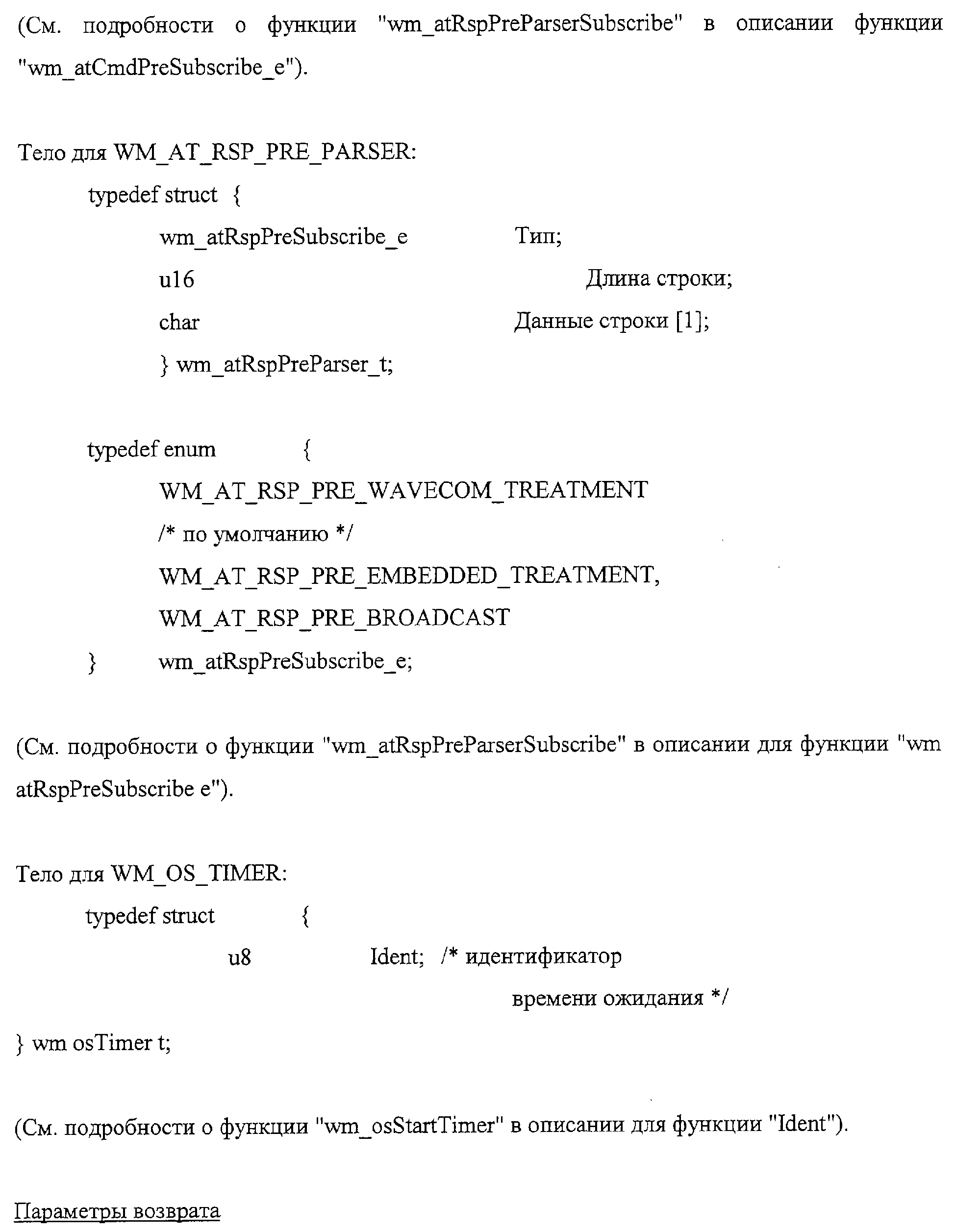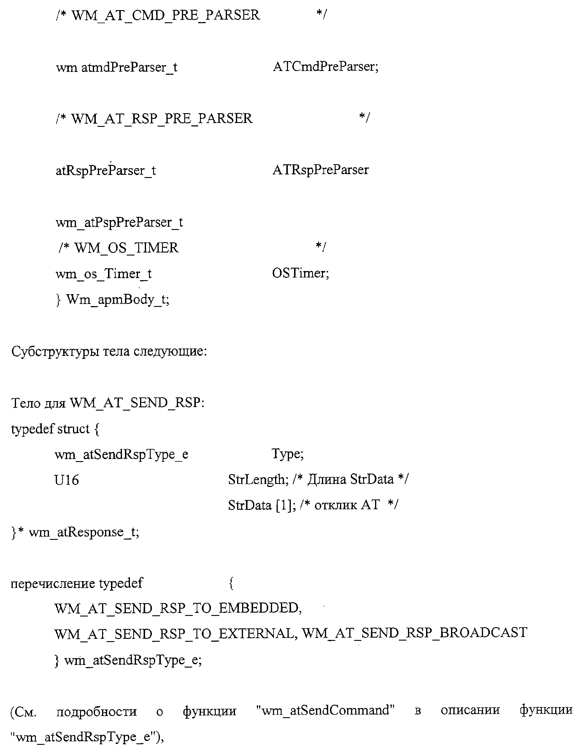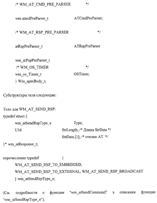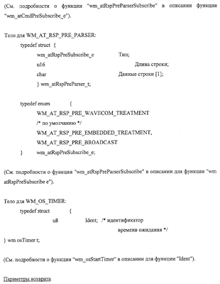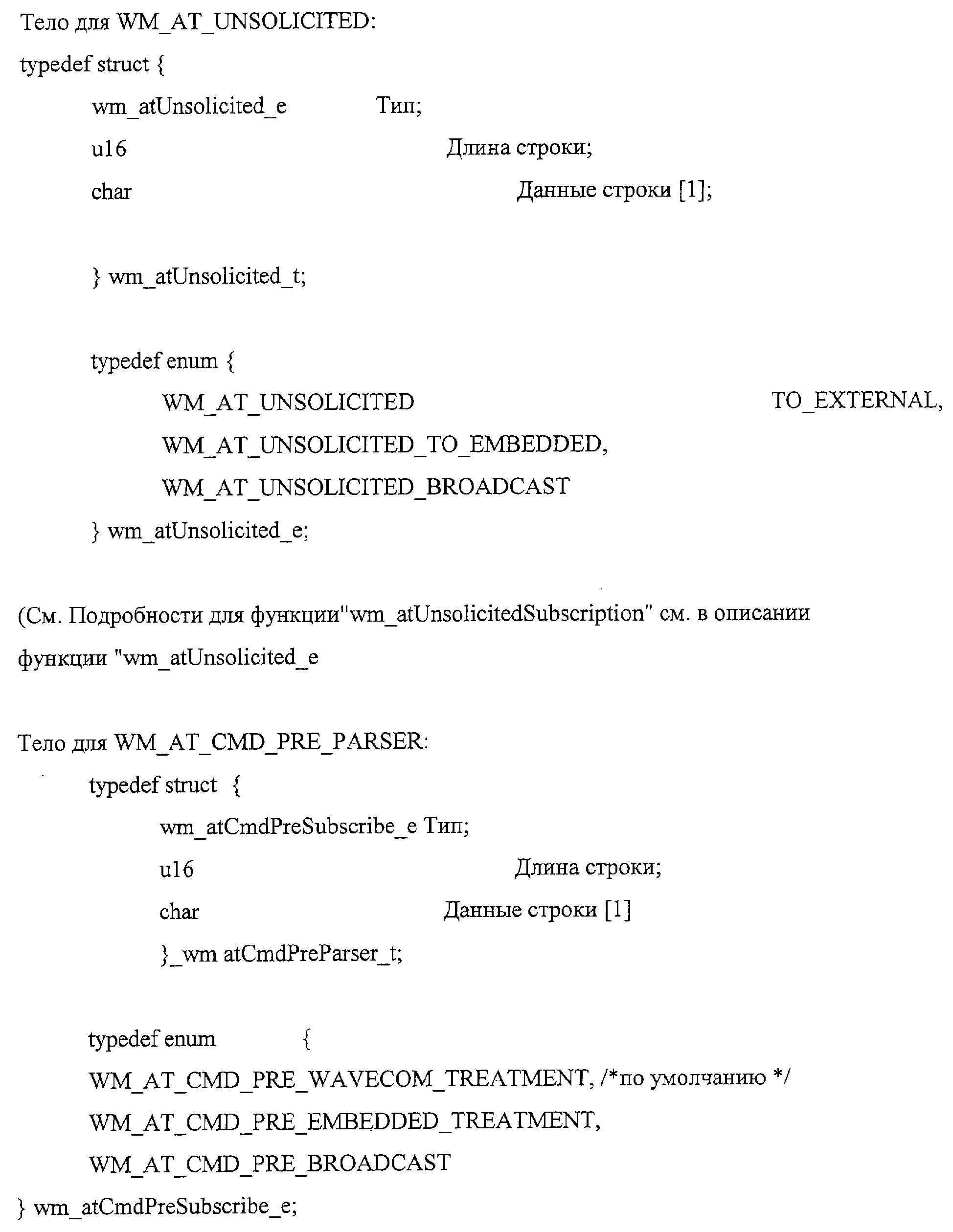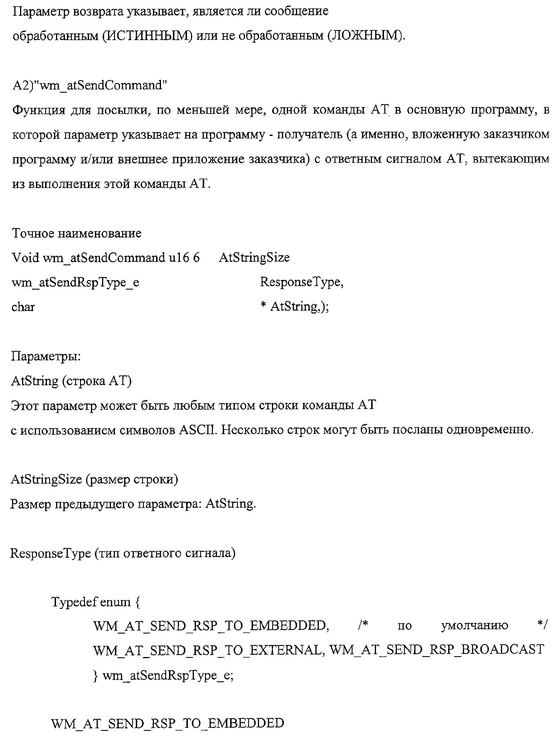 функция регистрации (“wm_atRspPreParserSubscribe”) с основной программой для обслуживания предварительного синтаксического анализа ответных сигналов, в которой параметр указанной функции регистрации указывает на приложение (или приложения) назначения, а именно внешнее приложение заказчика и/или программу, вложенную заказчиком, на которую должен быть направлен каждый ответный сигнал, вытекающий из выполнения команды драйвера основной программой;