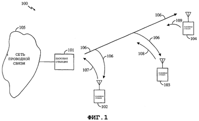 Фиг.1 иллюстрирует общую блок-схему системы 100 связи, которая может работать в соответствии с любым стандартом системы связи множественного доступа с кодовым разделением (МДКР), в то же время содержит различные аспекты изобретения. В целом система 100 связи включает в себя базовую станцию 101, которая обеспечивает линии связи между рядом подвижных станций, таких как подвижные станции 102-104, и между подвижными станциями 102-104 и сетью 105 проводной связи. Базовая станция 101 может включать в себя ряд компонентов, таких как контроллер подвижной станции, контроллер базовой станции и радиочастотный приемопередатчик. Для простоты такие компоненты не изображены. Базовая станция 101 также может взаимодействовать с другими базовыми станциями (не изображены). Базовая станция 101 взаимодействует с каждой подвижной станцией 102-104 через прямую линию связи. Прямая линия связи может поддерживаться сигналом прямой линии связи, передаваемым из базовой станции 101. Сигналы прямой линии связи, адресованные для подвижных станций 102-104, могут суммироваться, чтобы сформировать сигнал 106 прямой линии связи. Каждая из подвижных станций 102-104, принимающая сигнал 106 прямой линии связи, декодирует сигнал 106 прямой линии связи, чтобы извлечь информацию, которая адресована для ее пользователя.