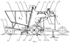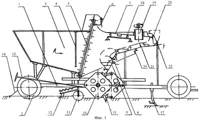 Предлагаемая машина (фиг.1) включает раму 1, опирающуюся на опорно-прикатывающие колеса 2, установленный на раме бункер 3 с разгрузочными стержнями 4 (фиг.3), которые расположены вертикально и горизонтально впереди питающего транспортера 5 и соединены между собой, эластичный ограничительный козырек 6 (фиг.1), установленный на сходе с питающего транспортера 5 над вогнутым лотком 7, ротор 8, механизм передачи корней 9, посадочные аппараты роторного типа 10, имеющие высаживающие конуса 11, загортачи 12 и копирующие колеса 13, шлейф 14, маркер 15, регулирующее устройство 16 и рыхлитель 17.