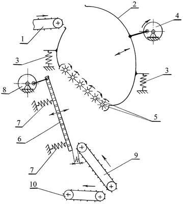 Данное устройство имеет подающий транспортер 1, протряхиватель вороха 2, который установлен на упругих опорах 3 и кинематически связан с механизмом 4 его направленных колебательных движений. Нижняя боковая часть протряхивателя 2 образована парами встречновращающихся приводных щеток 5, которые состоят из пучков эластичного ворса. Внизу, напротив встречновращающихся приводных щеток 5 установлена наклонная решетчатая вибрационная доска 6, которая установлена на двух упругих опорах 7 и кинематически связана с вибрационным приводом 8, что создает для наклонной решетчатой вибрационной доски 6 вибрационные колебания. Под нижний конец наклонной решетчатой вибрационной доски 6 сбоку подведена пальчатая очистительная горка 9 таким образом, что между поверхностью наклонной решетчатой вибрационной доски 6 и концом пальчатой очистительной горки 9 есть зазор h. В самом низу под наклонной решетчатой доской 6 и нижним концом пальчатой очистительной горки 9 установлен прутковый транспортер 10. Направления колебательных движений протряхивателя 2 и вибрационных движений наклонной решетчатой вибрационной доски 6 показаны стрелками.