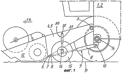 На фиг.1 представлена сельскохозяйственная машина 1, выполненная в виде зерноуборочного комбайна 2. В передней части машины имеется поперечная направлению FR движения ось 3, на которой установлено с возможностью поворота в вертикальном направлении приемное устройство 5, выполненное в виде наклонного конвейера 4, который сам по себе известен. Снизу на наклонном конвейере 4 образованы монтажные проушины 6, в которых установлена поперечная направлению FR движения ось 7 для крепления на ней с возможностью поворота передних концов поршневых штоков 8 подъемных цилиндров 9. Со стороны базовой машины подъемные цилиндры 9 присоединены к сельскохозяйственной машине 1 также с возможностью поворота вокруг поперечной направлению FR движения оси 10. При подаче давления в подъемные цилиндры 9 или отводе давления из них поршневые штоки 8 выдвигаются из цилиндров 11 подъемных цилиндров 9 или втягиваются в них, так что приемное устройство 5 совершает поворот в вертикальном направлении вокруг поперечной оси 3 на базовой машине 1. Кроме обеспечения поворотного движения приемного устройства 5 подъемные цилиндры 9 служат для опоры приемного устройства 5 на базовую машину 1.