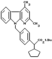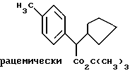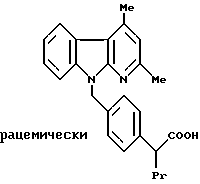 Пример XXСложный трет.бутиловый эфир 4-метилфенил-уксусной кислоты ![]() 450 г (3 моль) 4-метилфенил-уксусной кислоты (фирма Aldrich), 1,13 л (12 моль) трет. бутанола и 90 г (0,74 моль) 4-(N,N-диметиламино) пиридина растворяют в 2 л дихлорметана. Добавляют 680 г (3,3 моль) дициклогексилкарбодиимида, растворенного в 400 мл дихлорметана, затем размешивают при температуре 25oC в течение 20 часов, выпавшую мочевину отсасывают, промывают с использованием 200 мл дихлорметана, и органическую фазу промывают два раза с использованием 500 мл 2 М соляной кислоты и два раза водой. После этого органическую фазу сгущают и подвергают перегонке. Выход: 408 г (66% теории) Точка плавления: 73 – 78oC/0,2 мм Пример XXI Трет.бутиловый эфир 2-циклопентил-2-(4-метилфенил)уксусной кислоты ![]() 33,5 г (0,3 моль) трет.бутилата калия при температуре 0oC подают в 100 мл безводного диметилформамида, и каплями добавляют 51,6 г (0,25 моль) соединения, полученного согласно примеру XX, в 250 мл безводного диметилформамида. Размешивают при температуре 0oC в течение 30 минут, затем при температуре 5 – 15oC каплями добавляют 32,2 мл (0,3 моль) циклопентилбромида в 150 мл безводного диметилформамида и размешивают при температуре 25oC в течение 20 часов. Сгущают, остаток распределяют между водой и простым диэтиловым эфиром, эфирную фазу сушат над сульфатом натрия и сгущают. Продукт кристаллизуется. Выход: 67 г (97,5% теории) Точка плавления: 51 – 53oC Приведенные в таблице II соединения получают согласно методу аналогично примеру XXI. Пример XXVIII Сложный трет.бутиловый эфир 2-(4-бромметил-фенил)-2-циклопентил- уксусной кислоты ![]() 27,4 г (0,1 моль) соединения примера XXI растворяют в 200 мл тетрахлорметана и нагревают до кипения. Добавляют 0,82 г азабисизобутиронитрила, а затем порциями добавляют 18,7 г (0,105 моль) N-бромсукцинимида, после чего нагревают с обратным холодильником в течение часа, охлаждают до температуры 0oC, и сукцинимид отделяют путем фильтрации. После сгущения фильтрата продукт выпадает. Его промывают петролейным эфиром и сушат. Выход: 20 г (57% теории) Точка плавления: 73 – 76oC Приведенные в таблице III соединения получают согласно методу аналогично примеру XXVIII. Пример XXXV Сложный трет. бутиловый эфир 2-(R, S)-2-циклопентил-2- [4-(2,3-диметил- -карболин-9-ил) метил] фенилуксусной кислоты![]() 73,6 г (375 ммоль) полученного согласно примеру XIX соединения в 700 мл безводного N, N-диметилформамида подвергают взаимодействию с 42,13 г (375 ммоль) трет.бутанолата калия при температуре 25oC в течение 30 минут. Затем добавляют 161,7 г (375 ммоль) соединения, полученного согласно примеру XXVIII, в растворенном в 680 мл безводного N,N-диметилформамида виде. Взаимодействие завершено по истечении часа (контроль путем тонкослойной хроматографии с использованием смеси петролейного эфира и сложного эфира уксусной кислоты в соотношении 10:1). Для переработки добавляют 2 л буферного раствора (значение pH 4, фирма Merck) и 2 л воды, образовавшийся осадок отсасывают, промывают водой и повторно отсасывают. Немного мокрое твердое вещество последовательно размешивают с петролейным эфиром и метанолом и отсасывают. В результате сушки в вакууме над полупятиокисью фосфора получают 139,8 г (298 ммоль, 79% теории) целевого продукта. Точка плавления: 160 – 161oC Значение Rf: 0,39 (из смеси петролейного эфира и сложного эфира уксусной кислоты в соотношении 10:1) 1H-ЯМР (CDCl3, 250 МГц, TMS): = 0,91 (м, 1H), 1,18 – 1,68 (м, 6H), 1,87 (м, 1H), 1,47 (с, 9H), 2,42 (м, 1H), 2,66 (с, 3H), 2,83 (с, 3H)