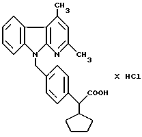 Пример LXIГидрохлорид 2-(R,S)-2-циклопентил-2-[4-(2,4-диметил – – карболин-9-ил)- метил]-фенилуксусной кислоты![]() 139,8 г (298 ммоль) соединения, полученного согласно примеру XXXV, растворяют в 1 л 1,4-диоксана и вместе с 240 мл концентрированной (37%-ной) соляной кислоты размешивают при температуре 70oC в течение 3 часов. По окончании взаимодействия (контроль путем тонкослойной хроматографии с использованием смеси петролейного эфира и сложного эфира уксусной кислоты в соотношении 10: 1) реакционную смесь охлаждают примерно до 15oC, после чего порциями выливают на 5 л воды. Значение pH доводят до 2,8 путем добавления 2 М водного натрового щелока, осадок отсасывают через бумажный фильтр и дополнительно промывают водой, пока значение pH промывной воды не превышает 4. Твердое вещество отсасывают, размешивают с 1 л петролейного эфира (пределы кипения 60 – 80oC), повторно отсасывают и сушат в вакууме над полупятиокисью фосфора. Выход: 130,3 г (290 ммоль, 97% теории) Точка плавления: 260 – 262oC Значение Rf: 0,51 (из смеси дихлорметана и этанола в соотношении 20:1) 1H-ЯМР (d6-ДМСО, 200 МГц, TMS): = 0,88 (м, 1H), 1,09 – 1,67 (м, 6H), 1,79 (м, 1H), 2,38 (м, 1H), 2,68 (с, 3H), 2,84 (с, 3H), 3,16 (д, 1H), 4,7 – 5,9 (1H), 5,80 (с, 2H), 7,12-7,26 (м, 5H), 7,32 (м, 1H), 7,49 (м, 1H), 7,59 (д, 1H), 8,17 (д, 1H).