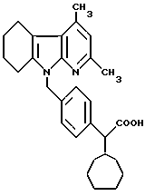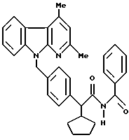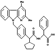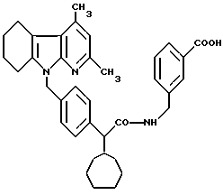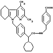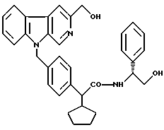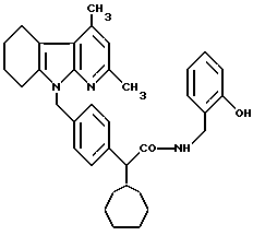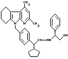 Пример 69N-(2-оксибензил)амид 2-(R, S)-2-[4-(2,4-диметил- 5,6,7,8-тетрагидро – – карболин-9-ил)-метил-фенил]-2-циклогептил- уксусной кислоты![]() 0,60 г соединения, полученного согласно примеру 58, кипятят с обратным холодильником в течение 22 часов в 3 мл метанола и 0,6 мл воды в атмосфере аргона в качестве защитного газа и в присутствии 33 мг 10 %-ного палладия на животном угле и 33 мг пара-толуолсульфокислоты в виде моногидрата. В случае неполной конверсии (контроль путем тонкослойной хроматографии с использованием смеси дихлорметана и этанола в соотношении 50:1) добавляют еще 33 г 10%-ного палладия на животном угле и 33 мг пара-толуолсульфокислоты в виде моногидрата и кипятят с обратным холодильником в течение дальнейших 24 часов. Катализатор отсасывают в горячем состоянии, промывают большим количеством горячего метанола, и фильтрат упаривают. В результате сушки в высоком вакууме над полупятиокисью фосфора получают 0,52 г продукта. Значение Rf: 0,33 (из смеси дихлорметана и этанола в соотношении 50:1) Пример 70 N-(R)-фенилглициноламид 2-(R, S)-2-[4-(3-оксиметил – – карболин-9-ил)-метил-фенил]-2-цикло-пентил-уксусной кислоты![]() К 500 мг (0,868 ммоль) соединения, полученного согласно примеру 31, в 5 мл безводного тетрагидрофурана в атмосфере аргона при температуре 0oC каплями добавляют 1,737 мл (1,737 ммоль) 1 М раствора аланата лития в тетрагидрофуране, и дополнительно размешивают при температуре 20oC в течение 4 часов. К реакционной смеси осторожно добавляют 5 мл воды, и путем добавления 2 М водной соляной кислоты доводят до значения pH, примерно равного 2. Водную фазу неоднократно экстрагируют простым диэтиловым эфиром и дихлорметаном, сушат над сульфатом натрия и упаривают. Сырой продукт подвергают хроматографии на силикагеле 60 (фирма Merck) с использованием в качестве элюента градиента дихлорметана до смеси дихлорметана и метанола в соотношении 50:1. Выход: 0,12 г Значение Rf: 0,26 (из смеси дихлорметана и этанола в соотношении 20:1) Приведенные в таблице 4 соединения получают согласно методу по примеру 70. Пример 73 N-(4-карбоксибензил)амид 2-(R, S)-2-[4-(2,4-диметил-5,6,7,8- тетрагидро – карболин-9-ил)-метил-фенил]-2- циклогептил-уксусной кислоты![]() 0,325 г (0,55 ммоль) соединения, полученного согласно примеру 60, при температуре 60oC в течение 18 часов подвергают взаимодействию с 0,5 мл водного 2 М натрового щелока в 3 мл метанола. Если согласно контролю путем тонкослойного анализа (с использованием растворителя F) взаимодействие не завершено, то добавляют еще 0,5 мл водного 2 М натрового щелока в 1 мл метанола и кипятят с обратным холодильником в течение 24 часов. Реакционную смесь охлаждают, путем добавления 1 М соляной кислоты доводят до значения pH, составляющего примерно 4. Осадок отсасывают, промывают водой и смесью петролейного эфира и простого диэтилового эфира в соотношении 5:1, и остатки растворителя удаляют в высоком вакууме над полупятиокисью фосфора. Выход: 0,154 г Значение Rf: 0,50 (из смеси дихлорметана, метанола и уксусной кислоты в соотно шении 90:10:2) Пример 74 N-(3-карбоксибензил)амид 2-(R, S)-2-[4-(2,4-диметил-5,6,7,8-тетрагидро- – карболин-9-ил)-метил-фенил]-2-циклогептил-уксусной кислоты.