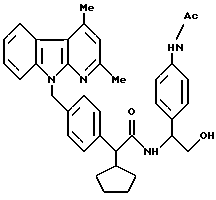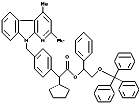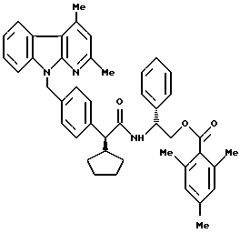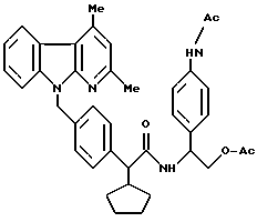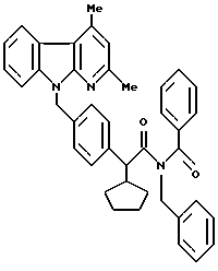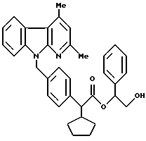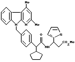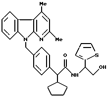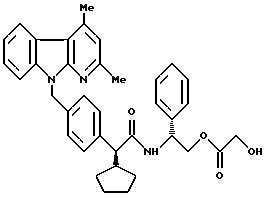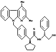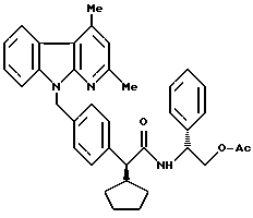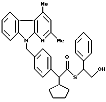 ![]() Целевое соединение получают аналогично примеру 73 из соединения, полученного согласно примеру 59. Значение Rf: 0,27 (из смеси дихлорметана и этанола в соотношении 20:1) Соединения, приведенные в таблицах 5, 6, 7, 8, 9 и 10, получают аналогично примеру 1. Соединения, приведенные в таблице II, получают аналогично примерам 1, 2 и 3. Соединения, приведенные в таблице 12, получают также согласно примерам 1, 2 и 3. Соединения, приведенные в таблице 13, получают аналогично примеру 73. Соединения, приведенные в таблице 14, получают аналогично примеру 70. Пример 138 N-[1-(R, S)-1-(4-ацетамидо-фенил)-2-окси- этил]амид 2-(R,S)-2-[4-(2,4-диметил- – карболин-9-ил)-метил- фенил]-2-циклопентил-уксусной кислоты![]() Часть А К 0,60 г (1,10 ммоль) соединения, полученного согласно примеру 137, в 10 мл дихлорметана добавляют 192 мкл (3,29 ммоль) триэтиламина, а затем при температуре 0oC подвергают взаимодействию с 70 мкл (0,99 ммоль) ацетилхлорида. Размешивают в течение 3 часов, причем температура реакционной смеси повышается до 20oC. Затем последовательно встряхивают с 1 М соляной кислотой, 0,1 М натровым щелоком и водой, органическую фазу сушат над сульфатом магния и упаривают. Часть Б Полученный таким образом сырой продукт согласно масс- спектру (FAB) двойно ацетилирован (631,57%, М+ + H / 653,6%, M+ + Na). Поэтому его при температуре 20oC в течение часа подвергают взаимодействию в 6 мл метанола с 2 М натровым щелоком. Добавлением 1 М соляной кислоты значение pH доводят до 2, и полученную реакционную смесь экстрагируют сложным эфиром уксусной кислоты. Органическую фазу промывают водой до нейтральности, сушат над сульфатом магния и упаривают в вакууме. В результате сушки в высоком вакууме получают 0,28 г продукта. Значение Rf: 0,17 (из смеси дихлорметана и этанола в соотношении 20:1) Пример 139 N-[1-(R, S)-1-(4-ацетамидо-фенил)-2-ацетокси- этил] амид 2-(R,S)-2-[4-(2,4-диметил- – карболин-9-ил)- метил-фенил]-2-циклопентил-уксусной кислоты![]() Целевое соединение получают путем взаимодействия соединения, полученного согласно примеру 137, аналогично части А примера 138 с 4 эквивалентами триэтиламина и 4 эквивалентами ацетилхлорида. Значение Rf: 0,56 (из смеси дихлорметана и этанола в соотношении 20:1) Соединения, приведенные в таблице 15, получают аналогично примеру 138. Пример 142 N-[1-(R)-1-фенил-2-ацетокси-этил] амид 2-(S)-2- [4-(2,4-диметил – – карболин-9-ил)-метил-фенил]-2-циклопентил- уксусной кислоты![]() 4,5 г (8,468 ммоль) соединения, полученного согласно примеру 2, суспендируют в 300 мл дихлорметана, добавляют 2,05 мл (25,4 ммоль) пиридина и 1,82 мл (25,4 ммоль) ацетилхлорида в 30 мл дихлорметана и подвергают взаимодействию при температуре 20oC в течение 20 часов. Реакционную смесь экстрагируют буфером, имеющим значение pH 2 (фирмы Merck), и водой, сушат над сульфатом натрия и упаривают. Затем перемешивают с метанолом и сушат в высоком вакууме над полупятиокисью фосфора, в результате чего получают 3,6 г продукта. Значение Rf: 0,62 (из смеси петролейного эфира и сложного эфира уксусной кислоты в соотношении 1:1) Соединения, приведенные в таблице 16, получают аналогично примеру 142. Пример 151 N-[1-(R)-1-фенил-2-ацетокси-этил]амид 2-(S)-2- [4-(2,4-диметил – – карболин-9-ил)-метил-фенил]-2-циклопентил- тиоуксусной кислоты![]() К 1,5 г (2,6 ммоль) соединения, полученного согласно примеру 142, в 50 мл диоксана добавляют 1,27 г (3,13 ммоль) 2,4-бис-(4- метоксифенил)-1,3-дитиа-2,4-дифосфетан-2,4-дисульфида, и кипятят с обратным холодильником в течение 5 часов. Реакци