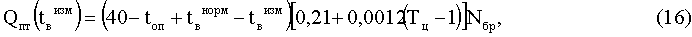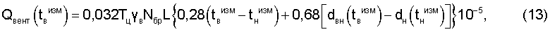 где Nбр – число бройлеров в птицезале, гол.; в 1,7 г/кг; L=70…100 м3/ч; tн – наружная температура, °С; dвн (tв з), dн(tн) – влагосодержание внутреннего и наружного воздуха, г/кг; Тц=t (t – по В.А.Грабаурову) – возраст поголовья, сут.