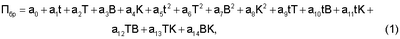 где а0, а1, …, а14 – коэффициенты уравнения регрессии, или константы: а0=-715,1; а1=6,354; а2=27,076; а3=9,594; а4=-0,870; a5=-0,025; а6=-0,343; а7=-0,050; a8=-0,009; а9=-0,104; а10=-0,024; а11=0,003; а12=-0,102; a13=0,012; а14=0,008 /см.: Грабауров В.А., Савченко Е.И. Исследование математической модели биологического объекта биотехнической системы. – Рукопись представлена РИСХМ (Ростовским институтом сельскохозяйственного машиностроения). Деп. во ВНИИТЭИСХ. №59 ВС – 87 Деп. – 6 с./.