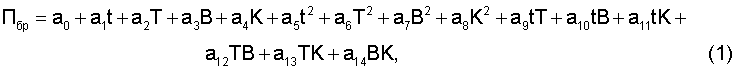 Математическая модель биологического объекта представляет собой зависимость продуктивности птиц (суточный прирост массы бройлеров от их возраста и от факторов микроклимата, в граммах массы) Пбр от возраста птиц t (в сутках) и основных параметров микроклимата – температуры воздуха Т (в градусах по шкале Цельсия), относительной влажности воздуха В (в процентах) и загазованности воздуха К (массовая концентрация аммиака в воздухе, мг/м3) /см.: Грабауров В.А. Задача оптимизации микроклимата в промышленных птичниках с учетом расхода энергии на отопление. Рукопись представлена РИСХМ (Ростовским институтом сельскохозяйственного машиностроения). Деп. во ВНИИТЭИСХ. №537 ВС – 85 Деп. – 17 с.; см. также: Грабауров В.А. Идентификация класса и структуры статической математической модели биологического объекта биотехнической системы в промышленном птичнике. – Рукопись представлена РИСХМ (Ростовским институтом сельскохозяйственного машиностроения). Деп. во ВНИИТЭИСХ. №469 – 84 Деп. – 6 с./: