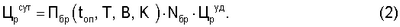Из биологии известно, что различие в развитии однотипных организмов сохраняются на протяжении всего периода их роста, поэтому цена будущей реализации суточного прироста массы бройлеров Цр сут определяется значением этого прироста Пбр (tоп, Т, В, К), кг·10-3/сут, количеством бройлеров в помещении Nбр, голов (примем обычное количество 20 тыс. голов в стандартном птицезале размерами 18·96 м), удельной ценой реализации конечной продукции птицефабрики Цр уд, руб./кг (примем 40 руб./кг):
