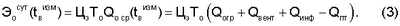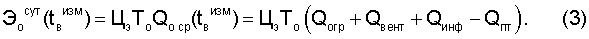 Суточная стоимость теряемой помещением тепловой энергии Эо(tв изм) пропорциональна удельной стоимости применяемого энергоносителя Цэ, руб./кВт·ч, в данном регионе страны, длительности времени опроса биотехнической системы (суточного отопительного периода в 24 ч) То и средней за этот период времени величине мощности системы общего обогрева Qоср(tв изм), кВт, которая определяется при средних за период То величинах температур внутреннего tв изм и наружного воздуха tн изм, °С: