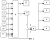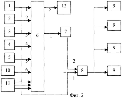 Фиг.2. Функциональная схема устройства управления обогревом: 1 – датчик ощущаемой температуры помещения; 2 – датчик температуры наружного воздуха; 3 – датчик температуры внутреннего воздуха помещения; 4 – датчик относительной влажности наружного воздуха; 5 – датчик относительной влажности внутреннего воздуха; 6 – вычислительный блок; 7 – блок управления; 8 – регулятор температуры; 9 – обогреватели (электрические, газовые и т.п.); 10 – датчик концентрации аммиака; 11 – блок задатчиков возраста поголовья, технологически допустимых наименьшего и наибольшего заданных значений ощущаемой температуры, времени опроса, сигнала сформированной величины ощущаемой температуры, констант; 12 – блок индикации стоимости потерь теплоты помещением с обогреваемыми животными или птицей Эо(tв изм).