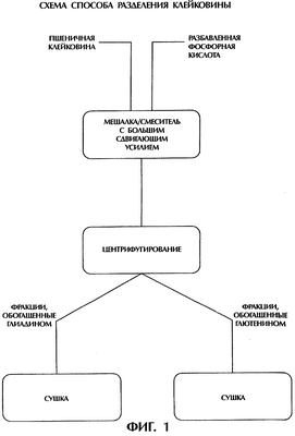 Типичный способ фракционирования данного изобретения обычно проводят при температуре от 10 до 40°С. В соответствии со схемой, показанной на фигуре 1, сухую пшеничную клейковину смешивают с кислым раствором в смесительном танке при непрерывном мониторинге pH при помощи pH-стата. Полученную таким образом дисперсию клейковины затем разделяют центрифугированием, в результате которого получают фракцию, обогащенную глиадином, и фракцию, обогащенную глютенином. Обогащенная глиадином фракция может быть сконцентрирована с помощью ультрафильтрации перед сушкой. Затем обогащенная глиадином фракция может быть высушена с использованием любого известного способа, причем предпочтительной является распылительная сушка. Проникшую часть можно рециркулировать и использовать в стадии смешивания. Обогащенную глютенином фракцию также сушат.