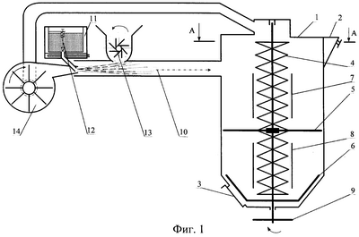 Работа устройства для перемешивания сухих кормов и внесения жировых добавок происходит следующим образом: 3/4 части исходных компонентов корма загружают в смесительную камеру 1 через загрузочный люк 2, а 1/4 часть корма поступает в смесительную камеру 1 из кормопровода 10 в виде смеси сухих кормов и жировых добавок, образуемых в результате смешивания исходных компонентов корма, подаваемых в кормопровод 10 из устройства для внесения жировых добавок 11 и дозатора-метателя сухого корма 13 путем их смешивания в воздушном потоке, создаваемом вентилятором 14. Загрузка смесительной камеры 1 производится до верхней кромки кожуха 7. При подаче крутящего момента к валу смешивающего шнека 4 с установленными на нем смесительными лопатками 5 и сводоразрушающимися лопастями 6, компоненты корма начинают перемешиваться, при этом корм, находящийся в нижней части смесительной камеры 1, при воздействии на него сводоразрушающих лопастей 6 захватывается смешивающим шнеком 4 и поднимается по нижнему кожуху 8 в среднюю часть смесительной камеры 1, где часть кормов в промежутке между кожухами выходит из области воздействия смешивающего шнека 4, дополнительно перемешивается смесительными лопатками 5 и вновь оседает в нижнюю часть смесительной камеры 1, а часть корма попадает в верхнюю часть смесительной камеры по верхнему кожуху 7, осыпается на выходе из него и вновь оседает в смесительную камеру 1, дополнительно перемешиваясь смесительными лопатками 5 и сводоразрушающими лопастями 6. За счет использования в конструкции предлагаемого устройства двухзаходного смешивающего шнека 4, смесительных лопаток 5, сводоразрушающих лопастей 6 и двух кожухов 7 и 8 производится более активное перемешивание компонентов и более интенсивная циркуляция корма по смесительной камере 1, что главным образом влияет на качество получаемой смеси. Процесс перемешивания компонентов продолжается заданный промежуток времени (время смешивания t=5…20 минут). Выгрузка готовой смеси производится при работающем устройстве через выгрузной лоток 6, что позволяет полностью очистить смесительную камеру 1. Частоту вращения шнека регулируют посредством изменения передаточного отношения привода.