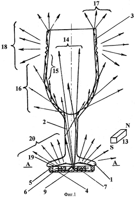 Вторая группа лучей, которые многократно отражаются от стенок ножки 2 рюмки при достижении изгиба, связанного со стенками 3 рюмки, частично выйдет через дно рюмки, а частично начнет распространяться вдоль стенок 3 рюмки. При каждом отражении от стенок 3 рюмки излучение либо полностью отразится от поверхности прозрачной стенки вследствие полного внутреннего отражения (например, группа лучей 15), когда угол падения излучения на стенки 3 будет меньше угла полного внутреннего отражения. В противном случае часть излучения пройдет через поверхность стенки 3, когда угол падения будет больше этого угла (например, группа лучей 16), а другая часть излучения отразится от этой стенки 3 внутрь и продолжит распространяться в материале рюмки до следующего очередного отражения от стенки 3 (и частичного прохождения излучения через нее) и т.д. Из-за неровностей внутренних и внешних поверхностей стенок 3 рюмки, от которых происходит отражение света, акты полного или частичного отражения света чередутся нерегулярным образом. Эти процессы отражений происходят многократно, луч будет по мере распространения в прозрачной среде ослабляться до тех пор, пока ослабленный по интенсивности луч не выйдет из рюмки (например, группа лучей 17). При этом часть излучения, вышедшая наружу вследствие многократных переотражений, будет восприниматься наблюдателем как окрашивание рюмки цветом излучающего в данный момент светодиода 7. Следует отметить, что всякий рельефный рисунок на внешней поверхности рюмки будет способствовать выходу световых лучей из стенок 3 рюмки, и этот рисунок будет выглядеть подкрашенным (например, группа лучей 18).