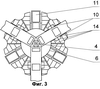на фиг.3 – подставка для елки, вид сверху (положение съемных ножек при самом маленьком диаметре ствола елки, фиксаторы расположены в крайних к центру пазах),