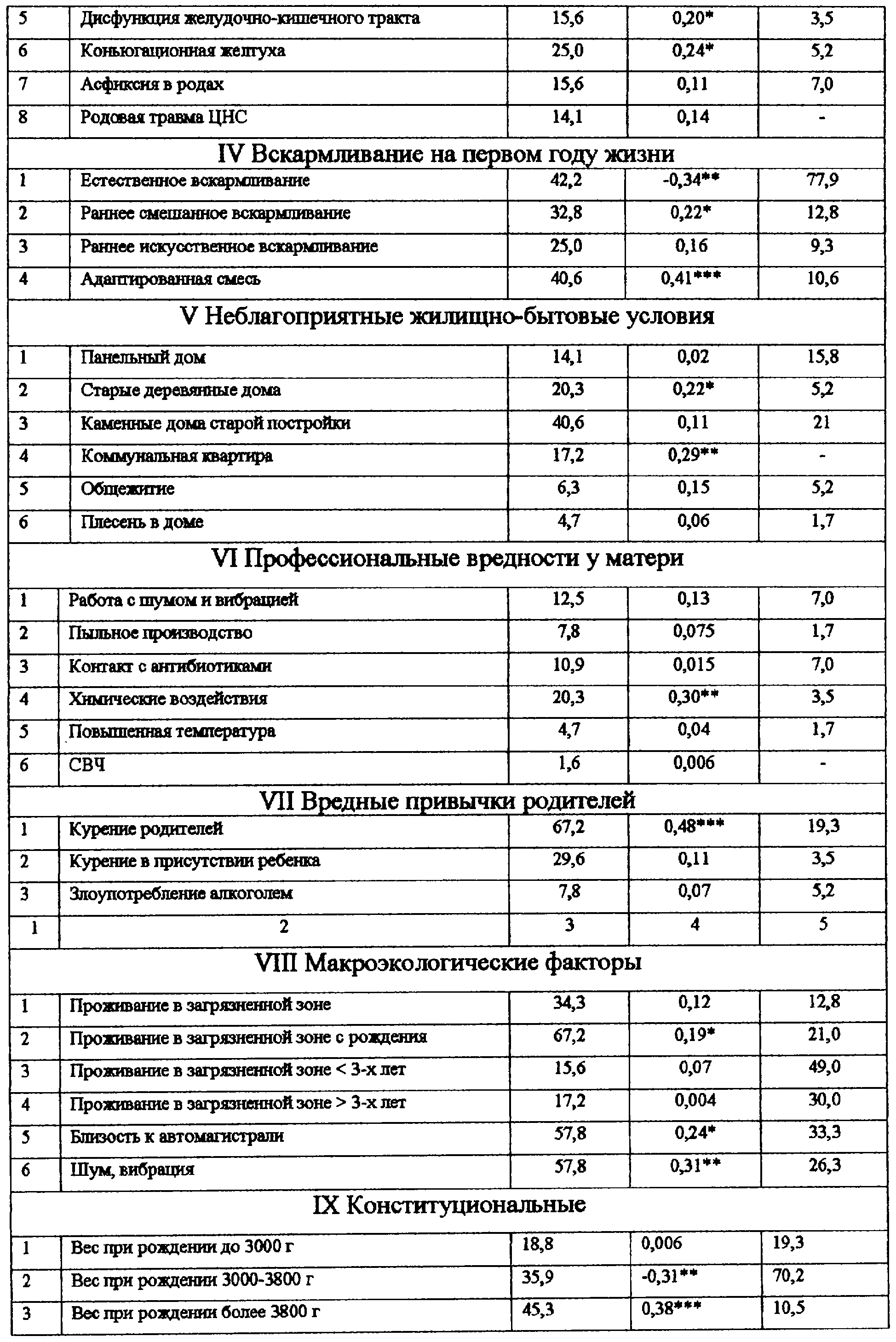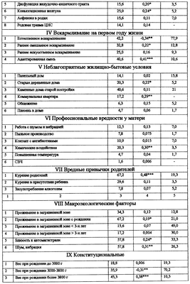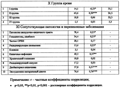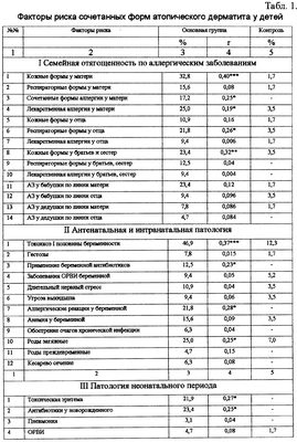 Для факторов, оказывающих влияние на развитие сочетанных форм атопического дерматита, вычисляют математическую функцию, линейно зависящую от переменных, связанных с наличием или отсутствием того или иного фактора. Если значение функции больше 0,5, то у больного возможно развитие сочетанных форм атопического дерматита, если меньше 0,5 – возможность развития сочетанных форм атопического дерматита маловероятно. Вычисление математического коэффициента (табл.2) проводят на основе экспериментальных данных с помощью ЭВМ, которая позволяет учесть в полном объеме комплекс факторов риска, влияющих в различные периоды жизни ребенка, начиная с антенатального периода развития.