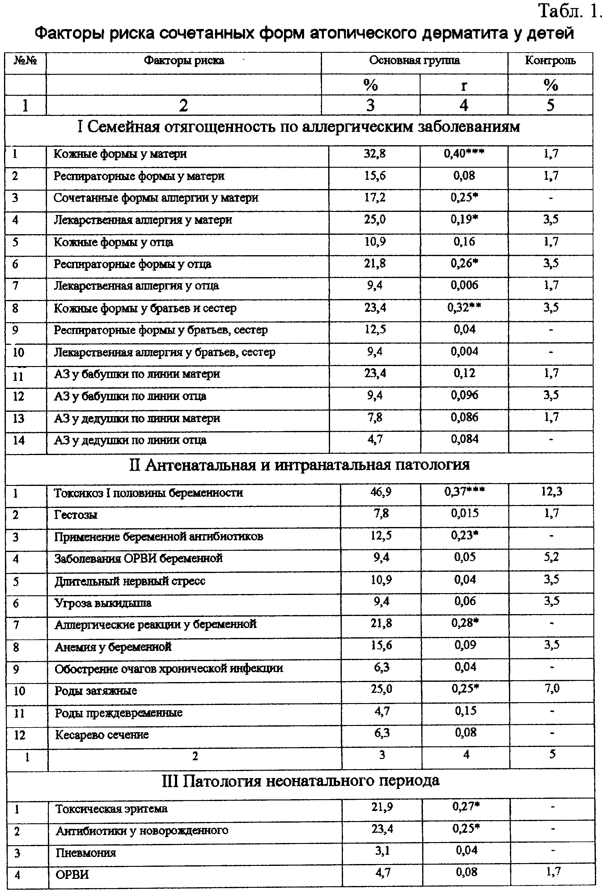 Предлагаемый способ индивидуального прогнозирования сочетанных форм атопического дерматита, основанный на изучении более 74 потенциальных факторов риска (табл.1) по результатам сплошного обследования 64 детей в возрасте от 1 года до 15 лет, достоверно связанных с заболеванием сочетанной формы атопического дерматита у детей.