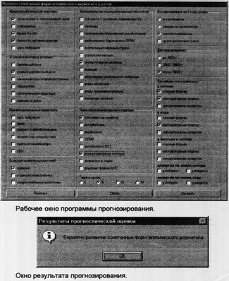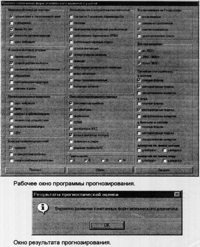 Пример №1. Больной М. 1,5 года. Предварительный диагноз: атопический дерматит, аллергический ринит. Родился весом 3000 г, токсикоз I половины беременности. Семейный анамнез отягощен: кожные формы аллергии у отца, респираторные формы у матери. Ребенок на раннем смешанном вскармливании с первых месяцев жизни. Проживает в загрязненной зоне, в каменном доме старой постройки в изолированной квартире с рождения. Отец курит, иногда в присутствии ребенка. Перенесенные заболевания: частые ОРВИ, кишечные инфекции. У ребенка II группа крови. Течение заболевания с периодами ремиссии и обострения. Окончательный диагноз: атопический дерматит, эритематозно-сквамозная форма, аллергический ринит. После ввода в программу компьютера факторов риска на мониторе появляется прогноз “вероятно развитие сочетанных форм атопического дерматита”.