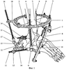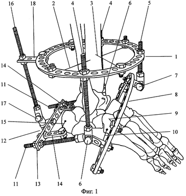 К осевым шарнирам 6 крепят резьбовые стержни 11, посредством которых с дугообразной опорой 8 соединяют П-образную опору 12, состоящую из планки 13 и двух кронштейнов 14. Важным моментом является расположение осевых шарниров 6 в проекции верхушки суставного отростка таранной кости, при этом условная линия, соединяющая осевые шарниры 6 между собой, должна располагаться в горизонтальной плоскости перпендикулярно длинной оси пяточной кости. Через бугор пяточной кости со стороны смещения в горизонтальной плоскости перпендикулярно длинной оси пяточной кости проводят спицу с упором 15 и фиксируют ее к кронштейнам 14 П-образной опоры 12. Посредством резьбового стержня 16 с двухосевым шарниром 17 соединяют П-образную опору 12 с планкой 18, смонтированной на базовой кольцевой опоре 1 в задней ее части.