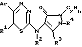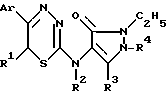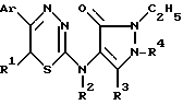 Соединения, подходящие для использования, представлены следующими примерами:1. 2-N-Метил-N-(1-фенил-2,3-диметилпиразол-5-он-4-ил)-амино-5-фенил-6Н-1,3,4-тиадиазин; 2. 2-N-Метил-N-(1-фенил-2,3-диметилпиразол-5-он-4-ил)-амино-5-(4-бромфенил)-6Н-1,3,4-тиадиазин; 3. 2-N-(1-фенил-2,3-диметилпираэол-5-он-4-ил)-амино-5-фенил-6Н-1,3,4-тиадиазин; 4. 2-N-Mетил-N-(1-фенил-2,3-диметилпираэол-5-он-4-ил)-амино-5-фенил-6Н-6-этил-1,3,4-тиадиазин; 5. 2-N-(1-фенил-2,3-диметилпиразол-5-он-4-ил)-амино-5-фенил-6Н-6-этил-1,3,4-тиадиазин; 6. 2-N-Метил-N-(1-фенил-2,3-диметилпиразол-5-он-4-ил)-амино-5-(4-этоксифенил)-6Н-1,3,4-тиадиазин; 7. 2-N-Метил-N-(1-фенил-2,3-диметилпиразол-5-он-4-ил)-амино-5-(4-хлорфенил)-6Н-1,3,4-тиадиазин; 8. 2-N-(1-фенил-2,3-диметилпиразол-5-он-4-ил)-амино-5-(3-бромфенил) -6Н-1,3,4-тиадиазин; 9. 2-N-Метил-N-(1-фенил-2,3-диметилпиразол-5-он-4-ил)-амино-5-(3-бромфенил)-6Н-1,3,4-тиадиазин. Примеры Все соединения получены с выходами 60-80% путем конденсации -галоарилалканонов с соответствующими 4-замещенными тиосемикарбазидами, протекающей гладко при нагревании в этаноле. Строение соединений доказано спектральными данными (УФ, ИК, 1H ЯМР); их чистота подтверждается данными тонкослойной хроматографии и элементного анализа.