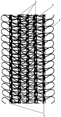 Для лучшего понимания сущности изобретения на чертеже представлена структура заявляемого имплантируемого устройства, где лента образована пятью продольными петельными столбиками: три внутренних (1) и два боковых (2), соединенных между собой поперечными протяжками (3) и боковыми гладкими, округлыми замкнутыми петлями (4).